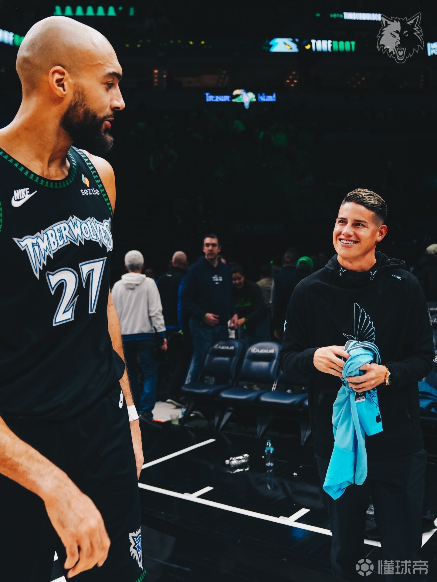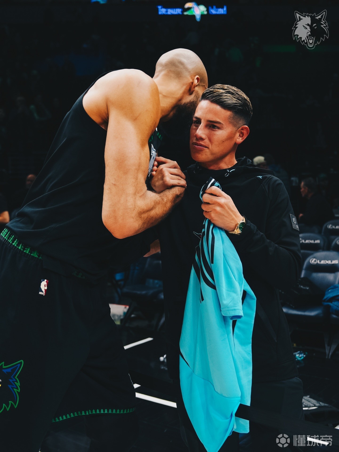 J罗现场观战森林狼,向戈贝尔赠送球衣&获赠签名球衣