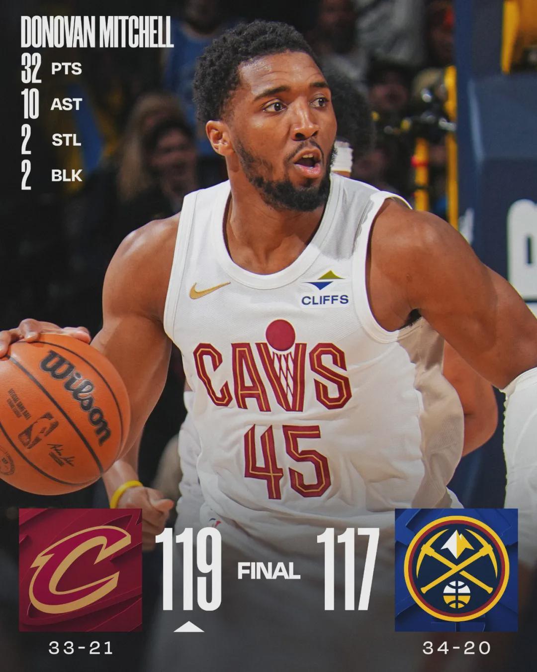 北京时间2月10日,NBA常规赛:骑士客场119-117逆转掘金。此役过后,骑士33胜21负依然排名东部第四,落后第三的凯尔特人1.5个胜场。掘金34胜20负继续排名西部第三,落后第二马刺多达3个胜场,领先第四火箭0.5个胜场。