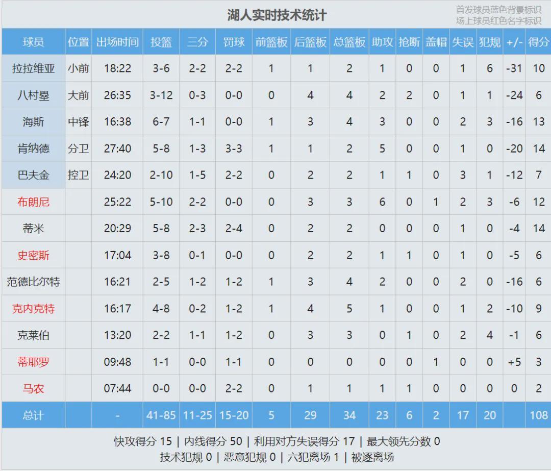 上半场打完,马刺84-55领先湖人29分。拉拉维亚半场打了14分钟,身背5次犯规;克莱伯替补出战8分钟,身背4次犯规。马刺喜忧参半,第二节还剩4分钟左右,卡斯尔在封盖八村塁之后,身体失去平衡重摔在地,随即退出比赛。